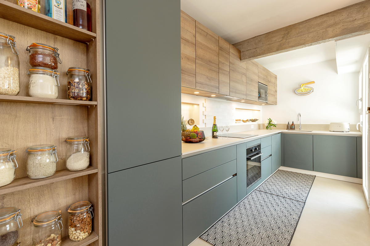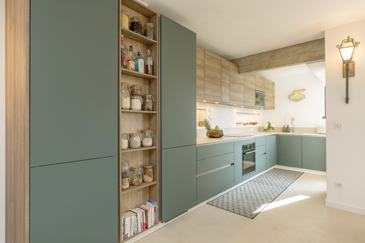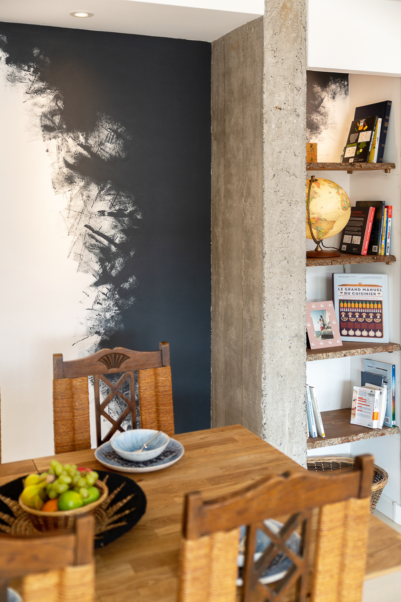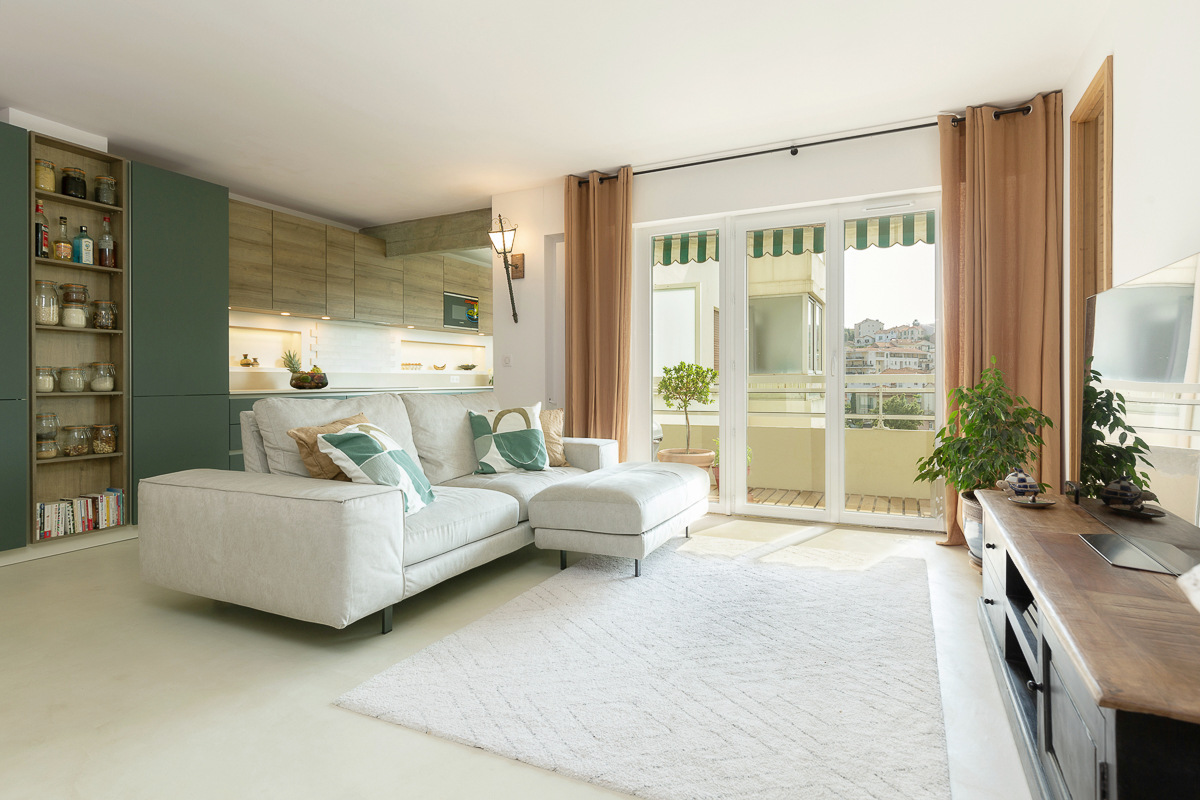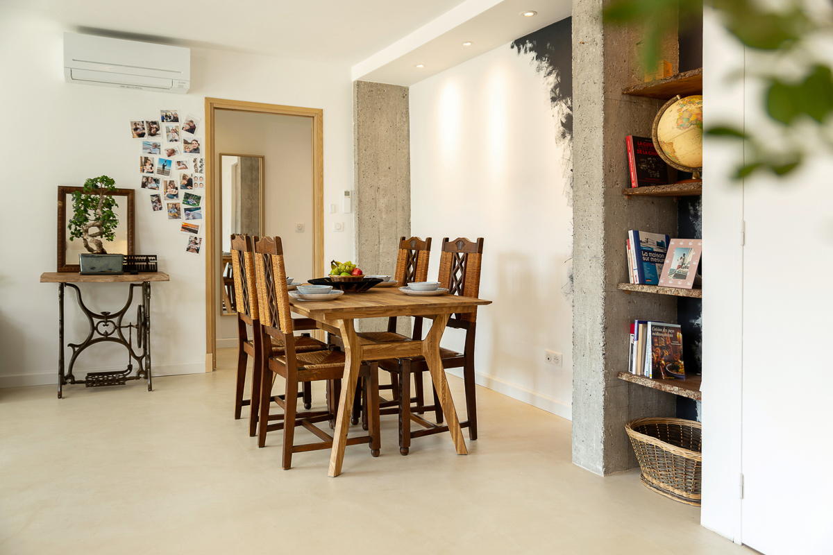 Une rénovation complète était nécessaire dans cet appartement dont les derniers travaux dataient des années 60. Le plan repensé s’organise désormais autour d’un espace de vie décloisonné et ouvert sur le salon, la salle à manger et la cuisine. L’espace disponible à rendu possible la création d’une troisième chambre. Les éléments structurels en béton laissés volontairement brut contrastent avec la douceur du béton ciré au sol. Du côté cuisine, les tonalités végétales et les tons bois confèrent une atmosphère moderne et chaleureuse.