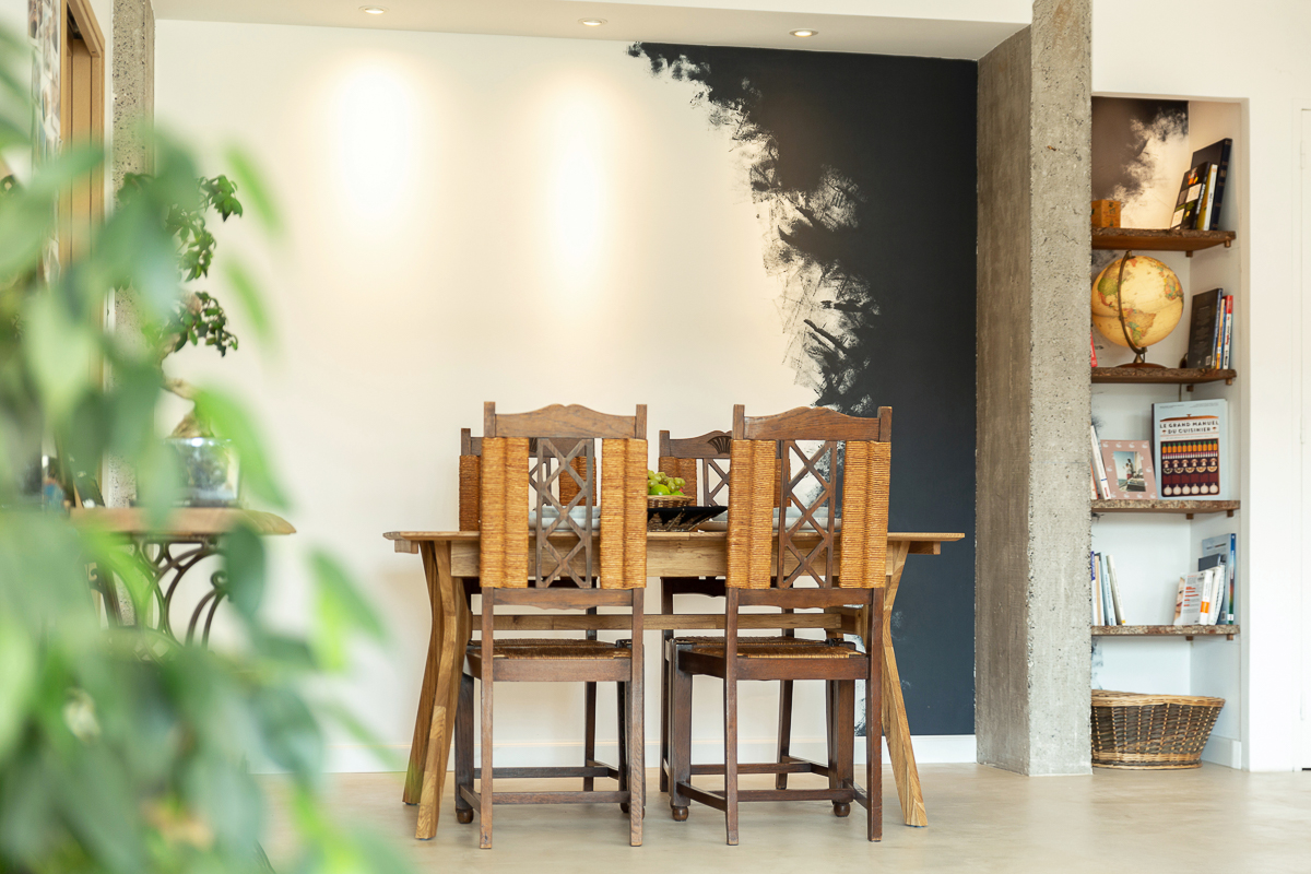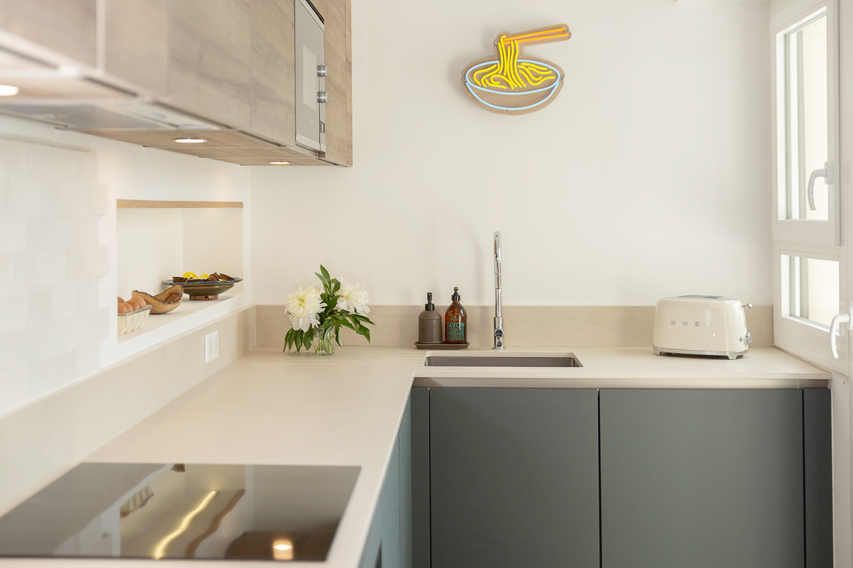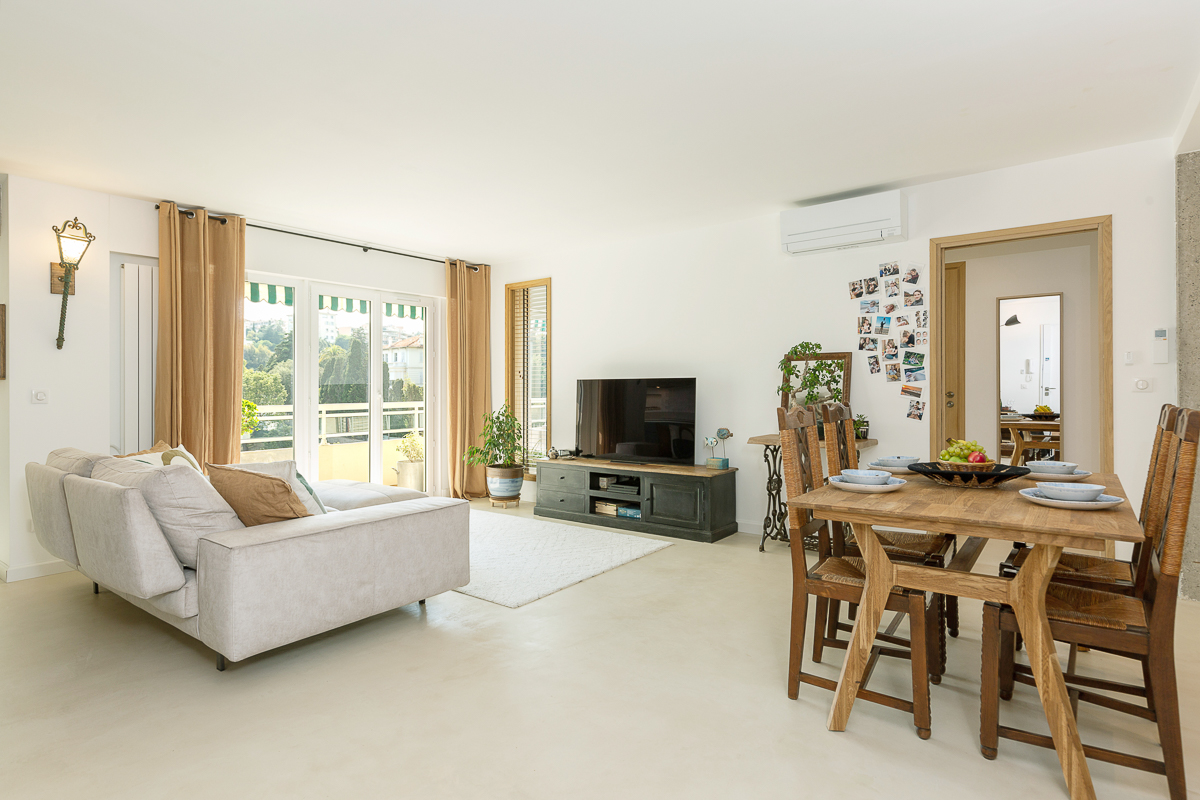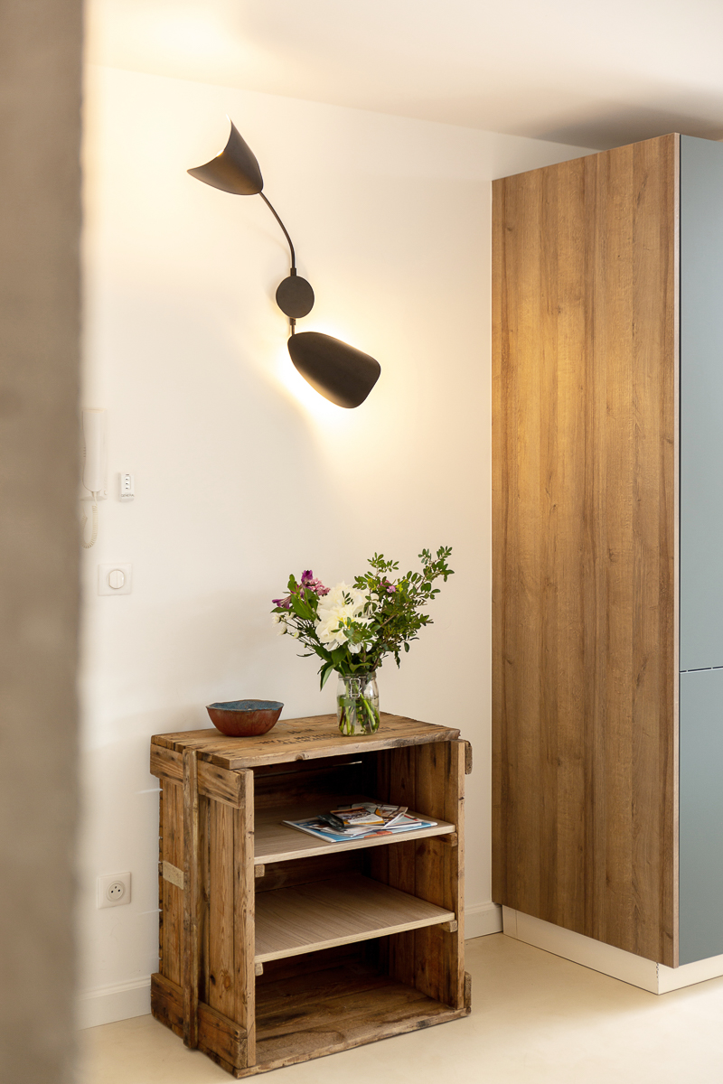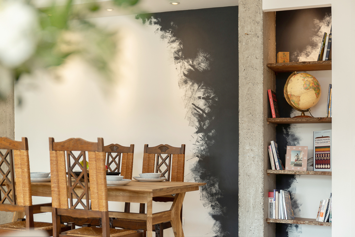 Une rénovation complète était nécessaire dans cet appartement dont les derniers travaux dataient des années 60. Le plan repensé s’organise désormais autour d’un espace de vie décloisonné et ouvert sur le salon, la salle à manger et la cuisine. L’espace disponible à rendu possible la création d’une troisième chambre. Les éléments structurels en béton laissés volontairement brut contrastent avec la douceur du béton ciré au sol. Du côté cuisine, les tonalités végétales et les tons bois confèrent une atmosphère moderne et chaleureuse.