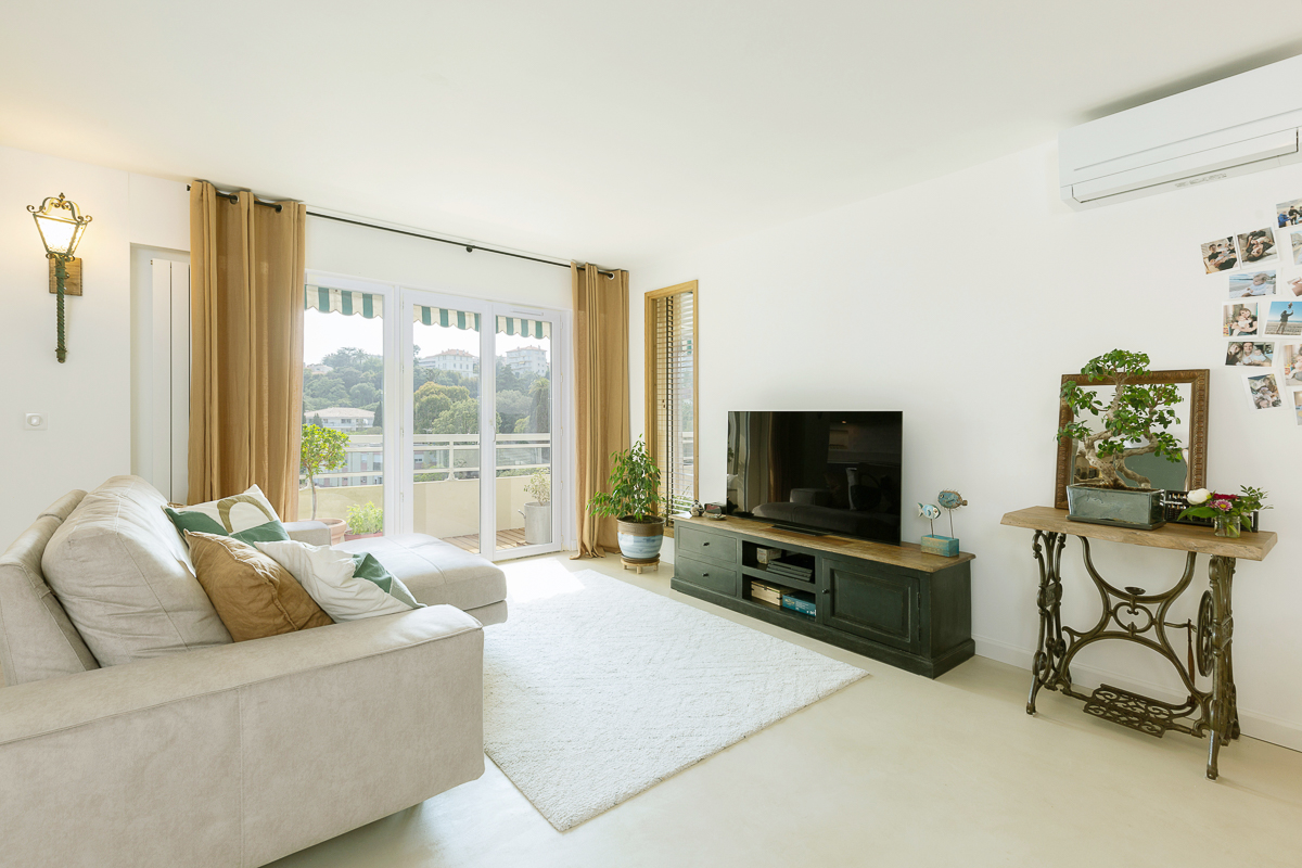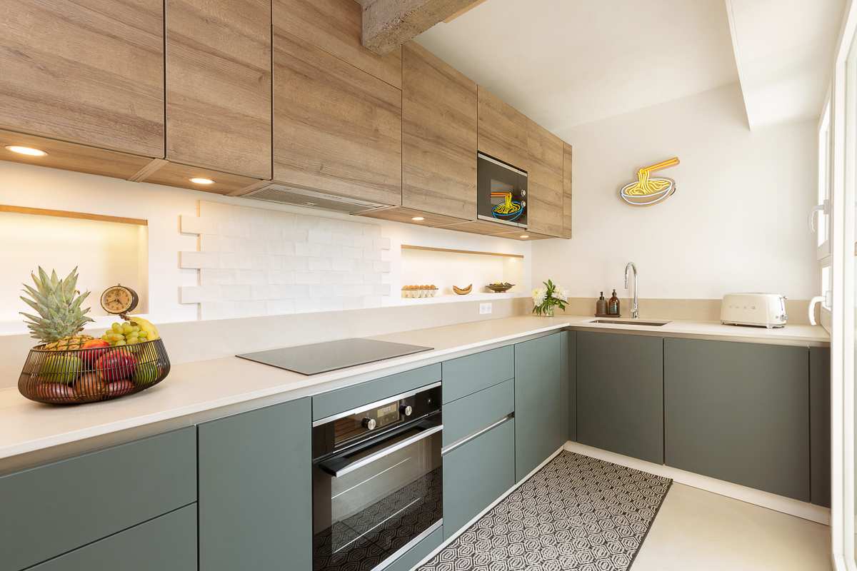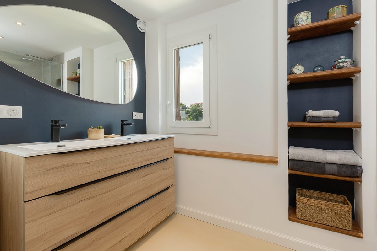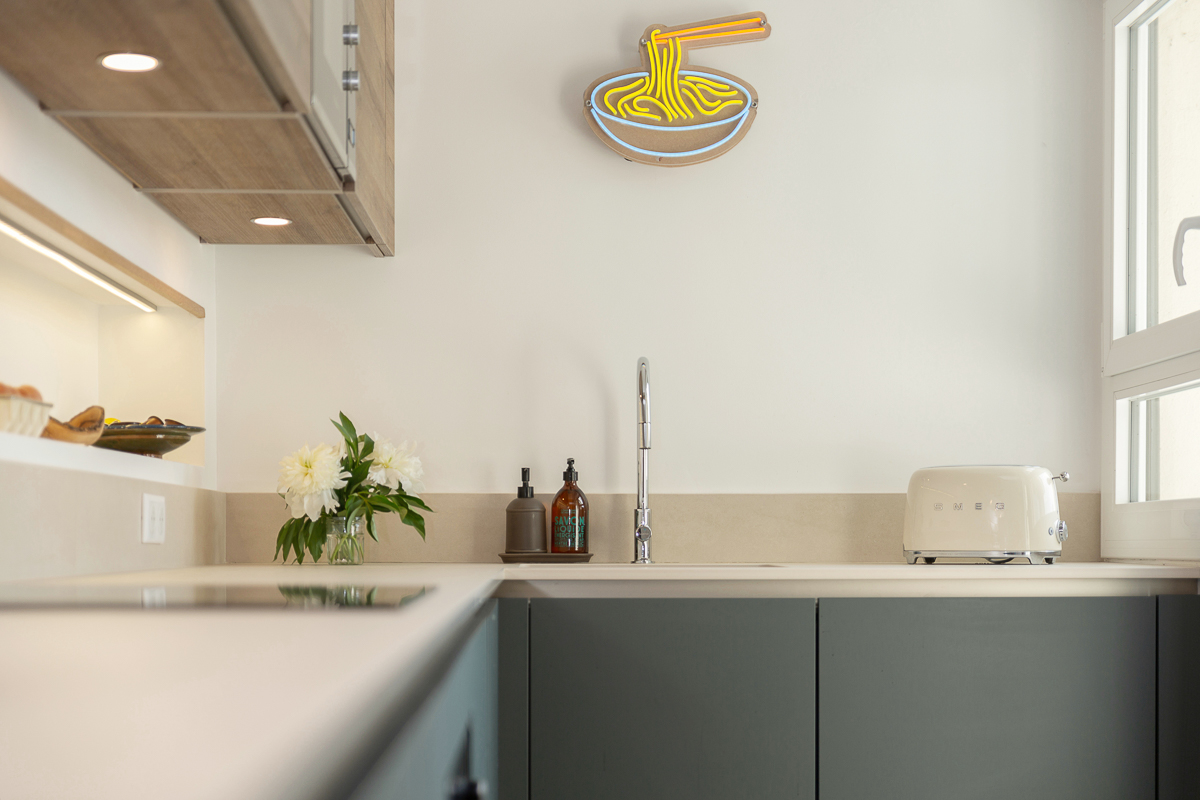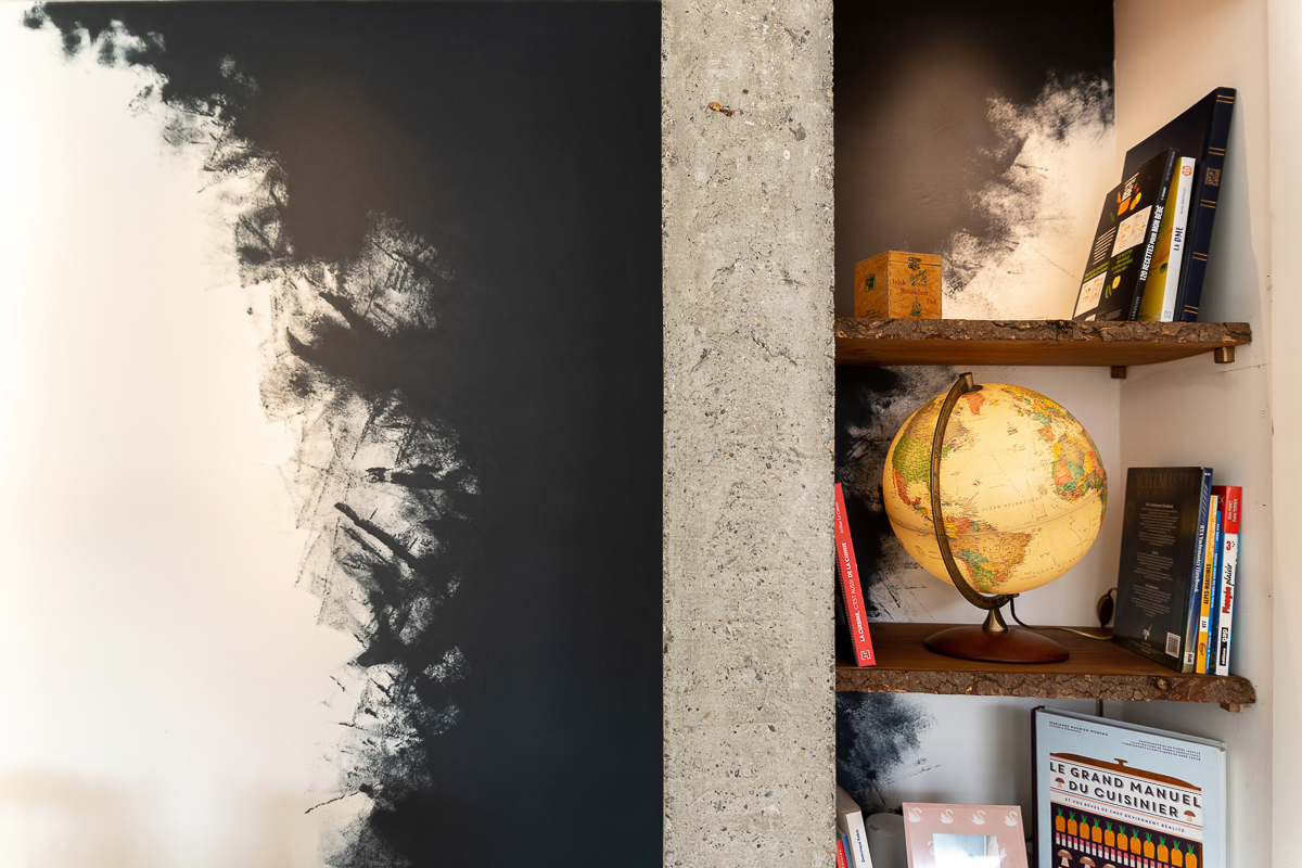 Une rénovation complète était nécessaire dans cet appartement dont les derniers travaux dataient des années 60. Le plan repensé s’organise désormais autour d’un espace de vie décloisonné et ouvert sur le salon, la salle à manger et la cuisine. L’espace disponible à rendu possible la création d’une troisième chambre. Les éléments structurels en béton laissés volontairement brut contrastent avec la douceur du béton ciré au sol. Du côté cuisine, les tonalités végétales et les tons bois confèrent une atmosphère moderne et chaleureuse.