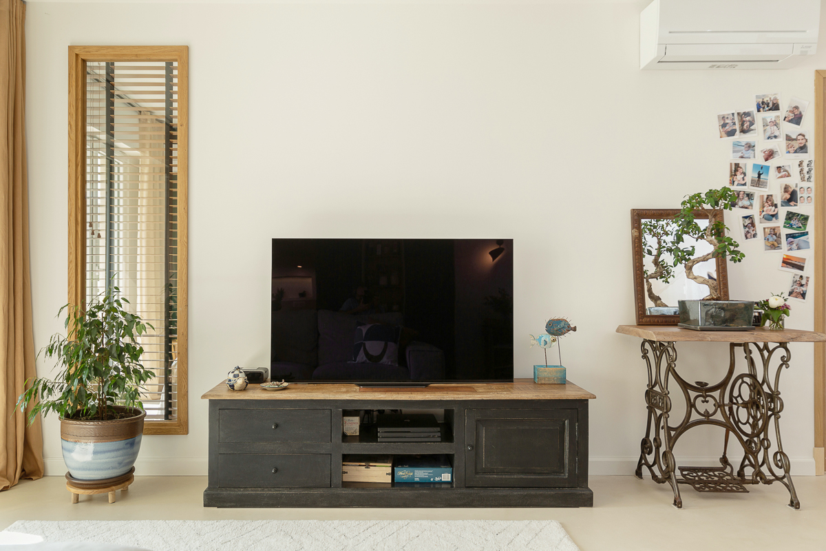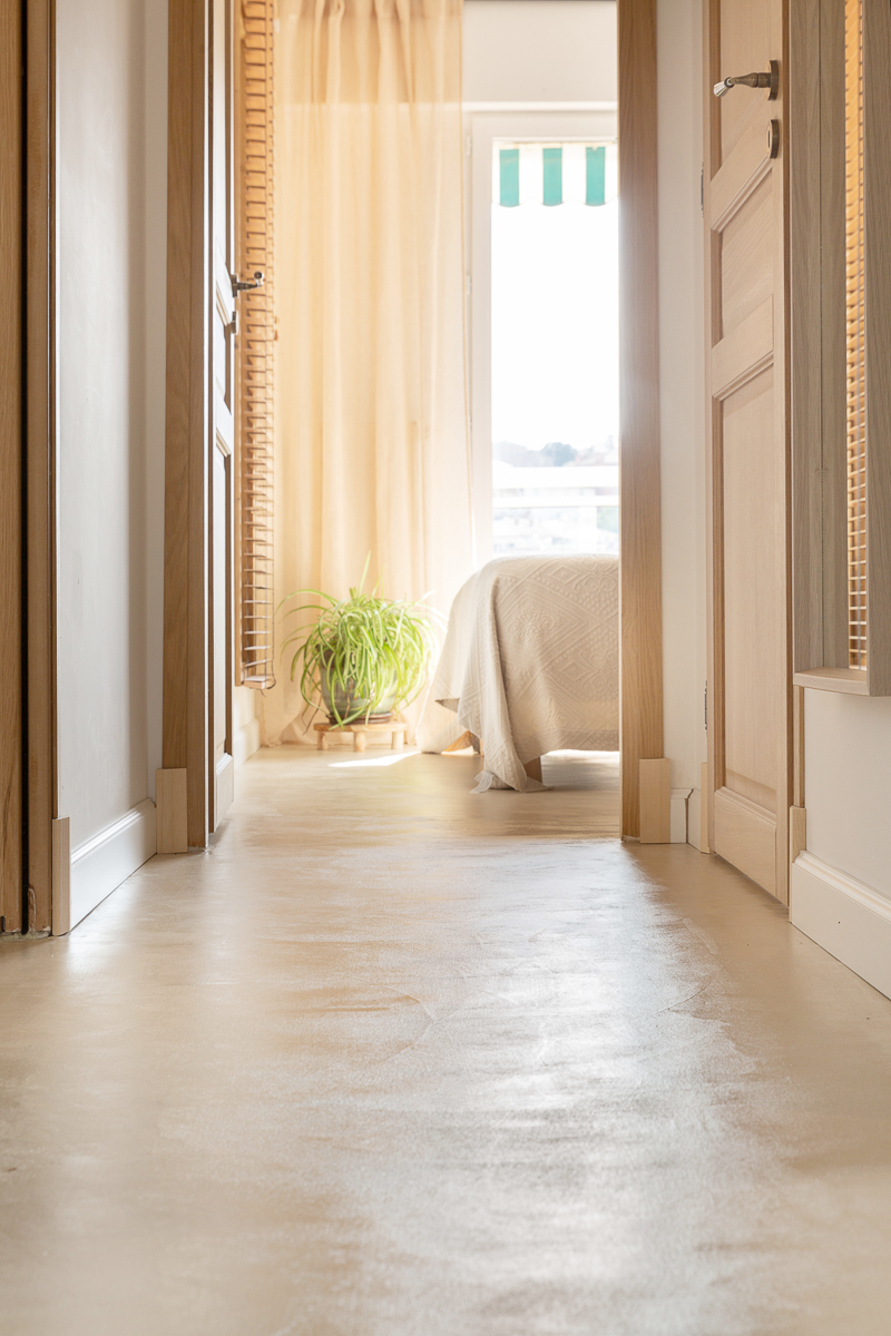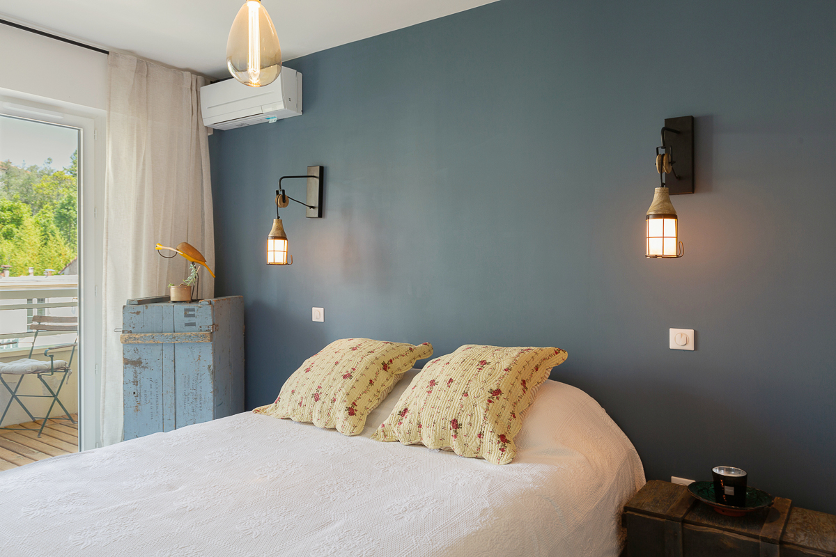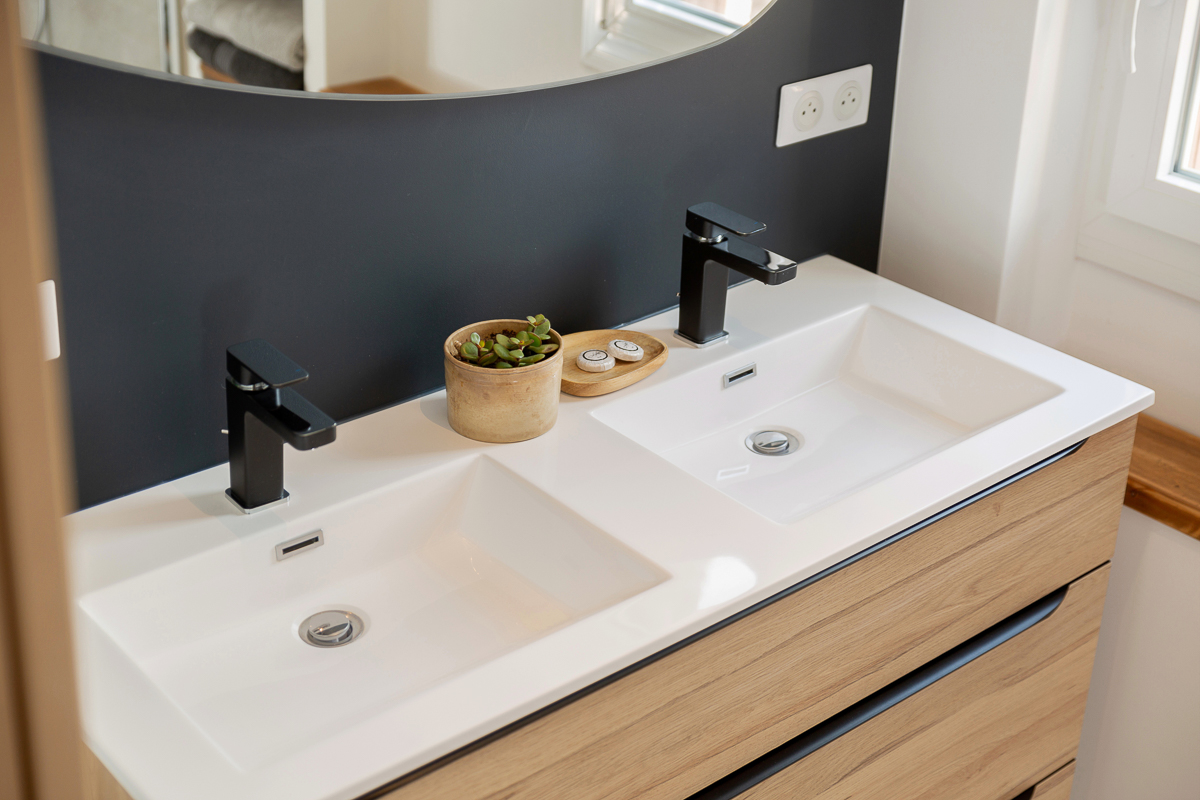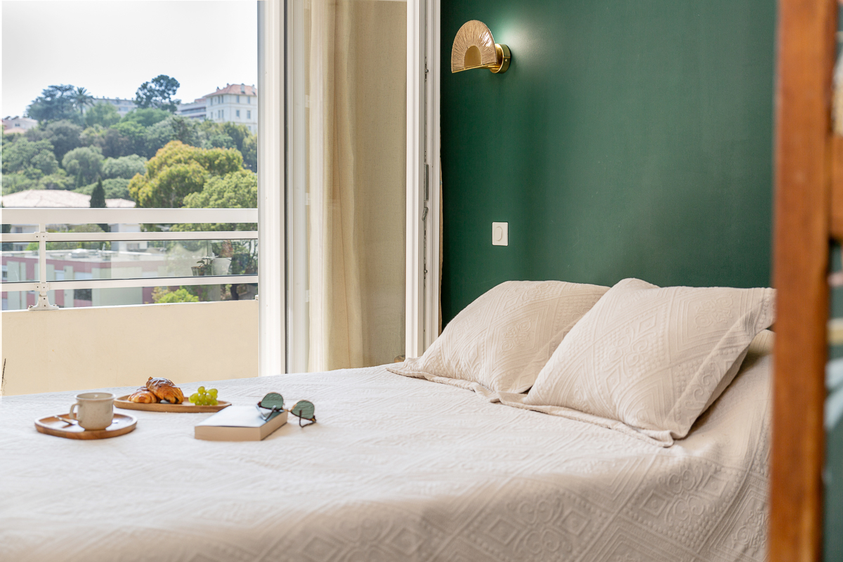 Une rénovation complète était nécessaire dans cet appartement dont les derniers travaux dataient des années 60. Le plan repensé s’organise désormais autour d’un espace de vie décloisonné et ouvert sur le salon, la salle à manger et la cuisine. L’espace disponible à rendu possible la création d’une troisième chambre. Les éléments structurels en béton laissés volontairement brut contrastent avec la douceur du béton ciré au sol. Du côté cuisine, les tonalités végétales et les tons bois confèrent une atmosphère moderne et chaleureuse.